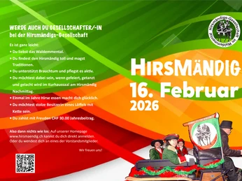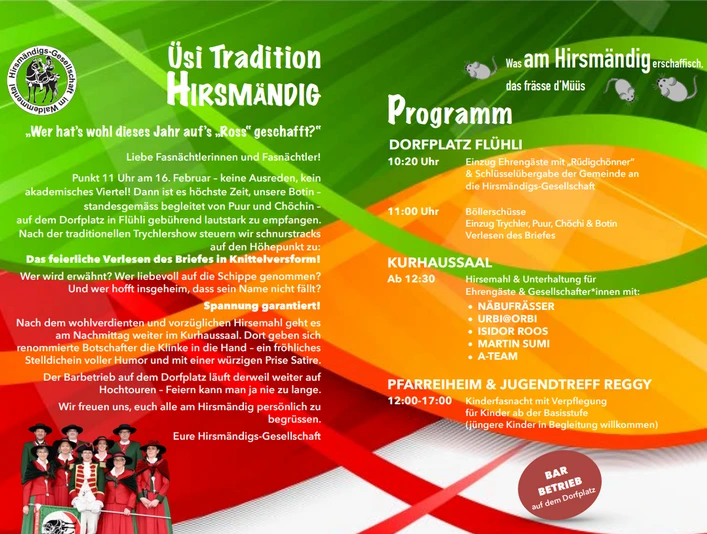 The Hirsmändig is a celebration of living tradition in Flühli. The Hirsmändigs Society invites young and old to a colorful carnival event with customs, music and humor. After the ceremonial entry, the Trychler show and the exciting reading of the letter, the festivities continue with a Hirsemahl, entertainment and a convivial get-together. A day full of carnival joy, tradition and community.
