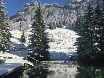 The circular hike to the Kneipp facility above the village Flühli offers a great view of the Schwändelifluh, also called the "Entlebuch Dolomites." The hike starts from the village Flühli towards the church and via Schlund up to the Kneipp facility. Although the entire facility is not operational in winter, it is still accessible. The facility is open daily from 6:00 am to 10:00 pm. The return route leads back via Hüttlenen along the Waldemme to the village center.